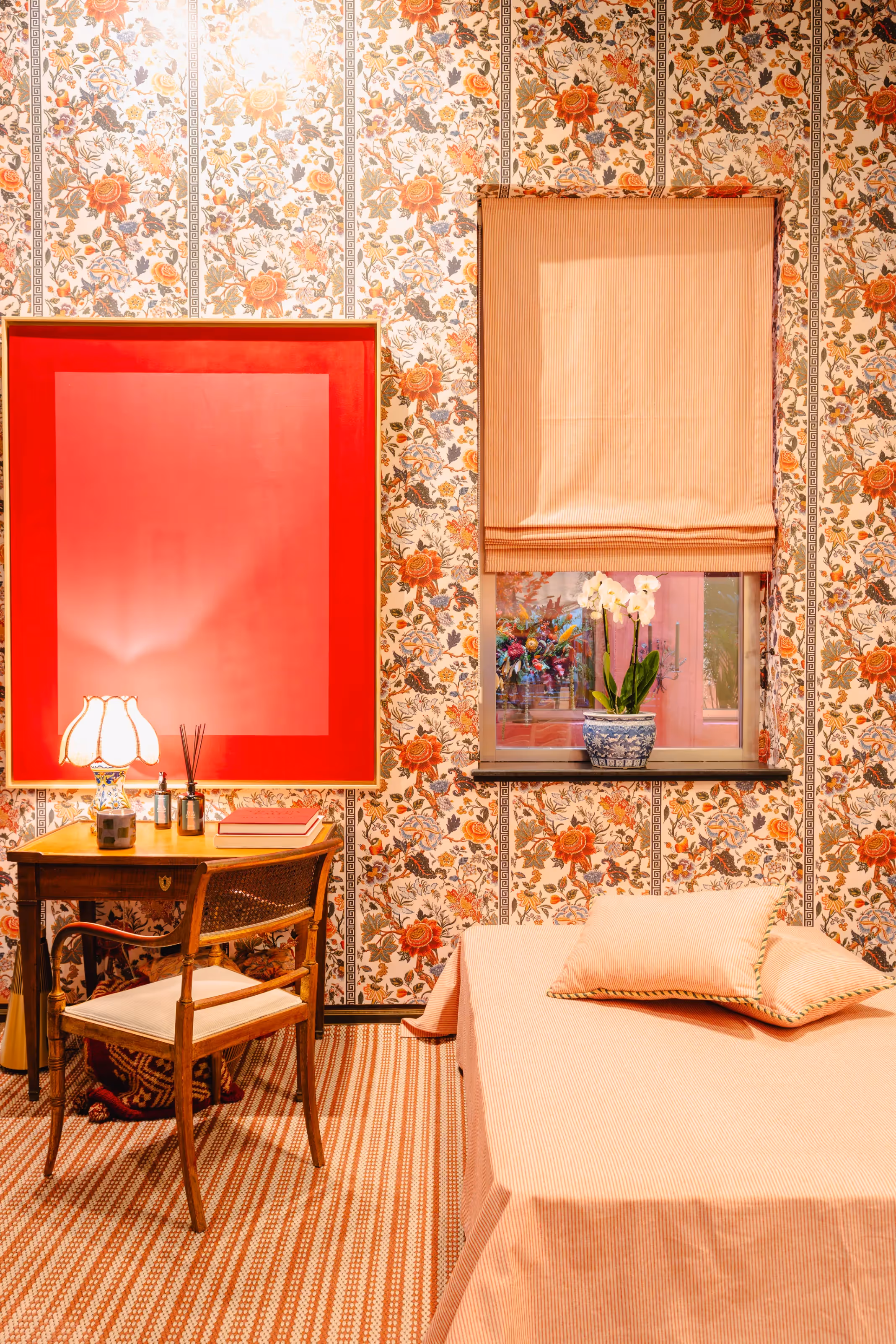 Un espacio inspirado en el clasicismo inglés, donde la serenidad se viste de color y la naturaleza se traslada al interior. Los tonos verdes evocan la calma de un jardín campestre, mientras las flores antiguas del papel pintado sugieren la nostalgia de un paisaje en eterna primavera. La calidez de las texturas envuelve el ambiente, creando una atmósfera íntima y contemplativa.